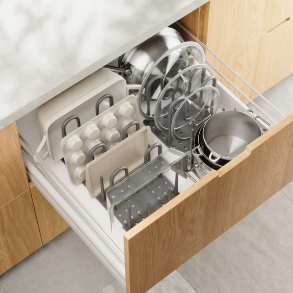 - パントリー/キッチン: ワイヤー棚は空気の循環を可能にし、こぼれたものを簡単に掃除できるので理想的です。小物用の棚ライナーを追加します。